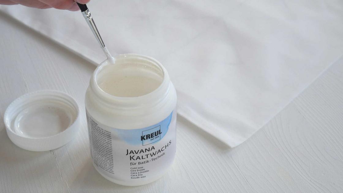 Die KREUL Batik-Textilfarbe ist ideal zum Färben von Seide, Baumwolle, Viskose, Leinen, Halbleinen, Wolle und Polyamid. Das Farbpulver ist mit Färbesalz vorgemischt. So ist das Granulat gebrauchsfertig und kann direkt in heißem Wasser gelöst werden. Mal mehr, mal weniger – je nachdem wie intensiv T-Shirts, Kissenhüllen oder Taschen gefärbt werden sollen. Doch wie entstehen weiße Linien im Farbenrausch? Das Geheimnis ist das KREUL Javana Kaltwachs. Wo es aufgetragen wird, deckt es den Stoff ab. Auf die gewachsten Stellen kann keine Farbe gelangen und es entstehen herrliche, weiße Bereiche inmitten intensiver Farbe. Das Wachs ist geschmeidig und muss nicht extra erhitzt werden, es ist bereits „kalt“ genau richtig und kann benutzt werden.