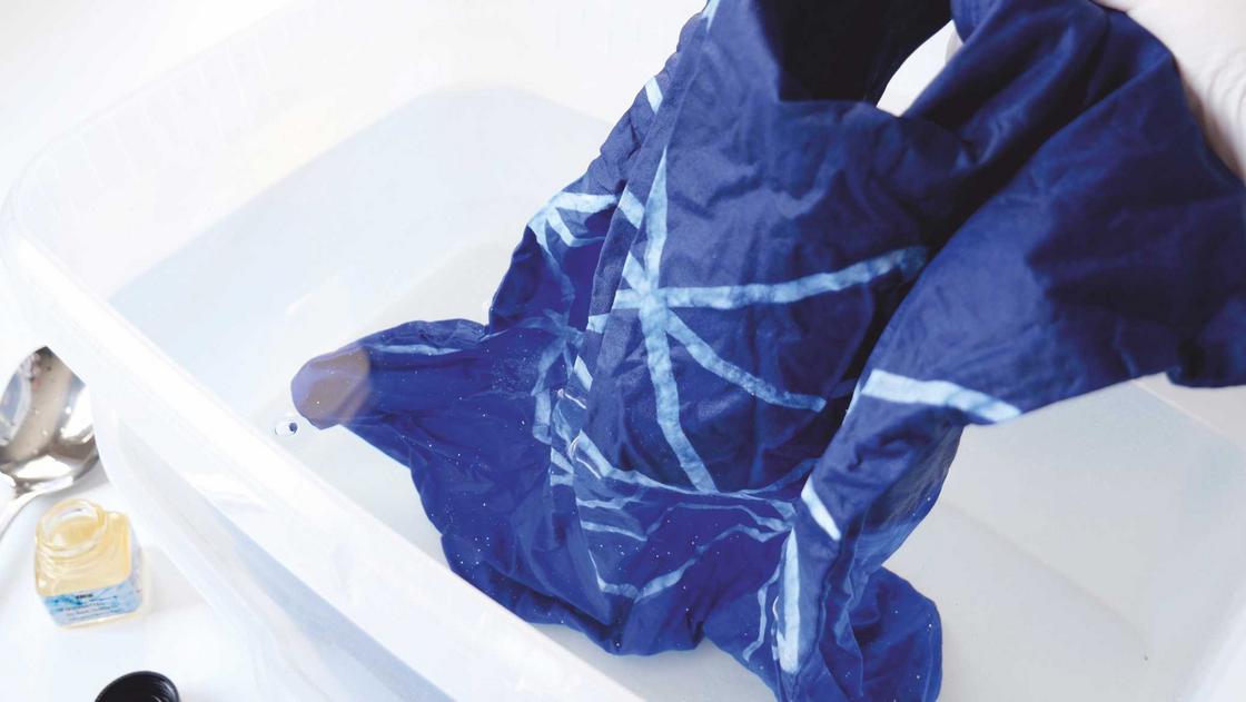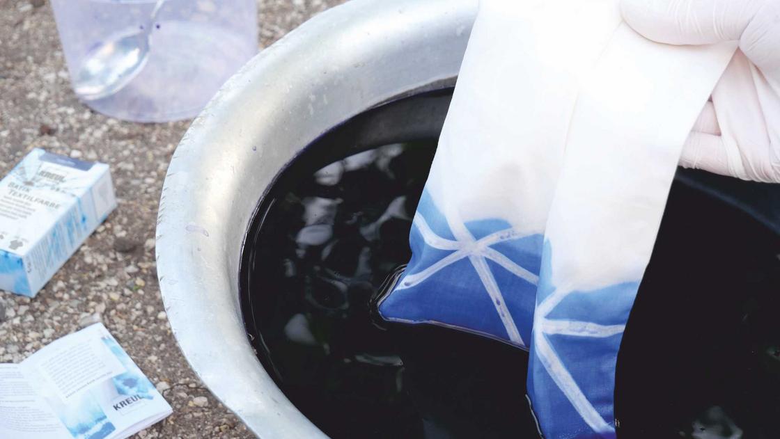 Jetzt wird es für die Textilien Zeit, Farbe zu bekennen. Wir legen den Stoff in das vorbereitete Färbebad und lassen die Farbe das Gewebe durchdringen. Dabei sollte der Stoff nicht zu stark geknickt werden, da sonst das Wachs brechen kann. Sobald unser Lieblingsfarbton erreicht ist, waschen wir den gefärbten Stoff aus bis das Wasser klar wird. Zum Schutz vor späterem Verfärben legen wir den Stoff für 15 Minuten in ein Bad aus klarem Wasser und Fixiermittel. Dabei rühren wir mehrmals durch, damit das Fixiermittel gleichmäßig an alle Stellen gelangt. Dann kann der Stoff auf der Wäscheleine getrocknet und schon ein wenig bestaunt werden. Umwerfend schön wird unser Kunstwerk jedoch, nachdem wir das Kaltwachs entfernt haben. Dazu den trockenen Stoff mit Papiertüchern abdecken und mit dem Bügeleisen bei Baumwolleinstellung das Wachs herausbügeln.
