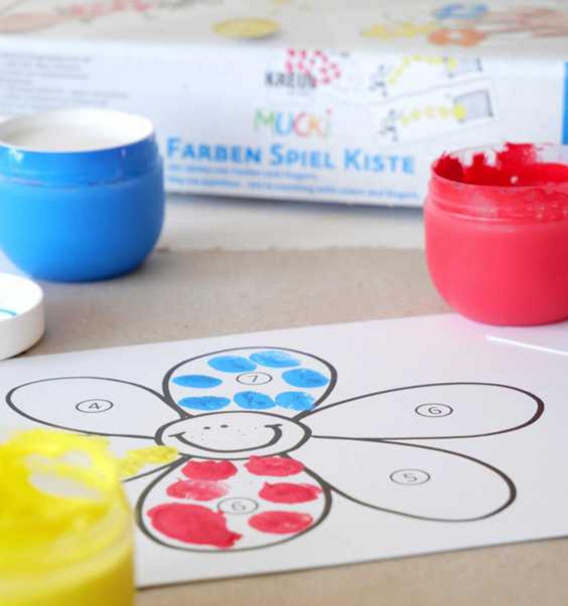 Spannung, Spaß und Spiel: Die MUCKI FarbenSpielKiste „Wir zählen mit Farben und Fingern“ enthält bebilderte Karten mit Aufgaben, eine Spielanleitung sowie die MUCKI Fingerfarbe in Rot, Blau, Gelb, Schwarz und Weiß. Ist der Zeigefinger bereit? Dann können Mama oder Papa mit der Zahlengeschichte beginnen. Schnell wird klar: Die Lösung der Zahlen-Rätsel muss mit Farbe getupft werden. Jetzt bekommen Marienkäfer ihre Punkte und Möhren wachsen in die Länge. Ist die Farbe von Möhren nicht Orange? Kein Problem. Das lernen die kleinen Farbexperten mit der bebilderten Anleitung einfach selbst zu mischen.