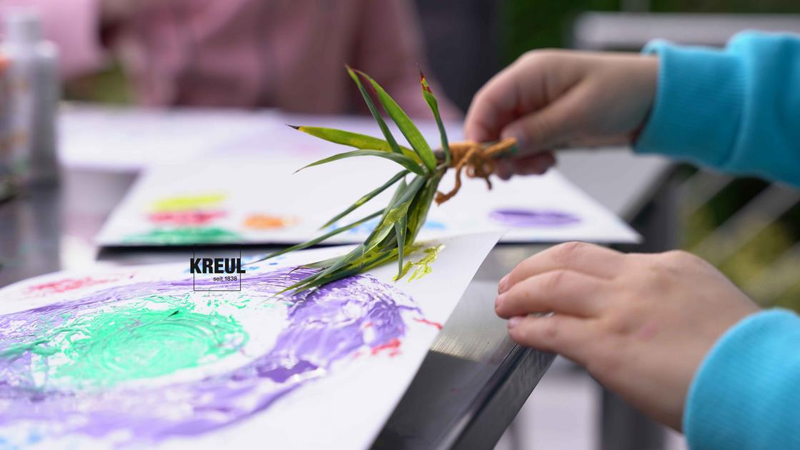 Bei so viel Farbe ist es gut, wenn man sich auf einwandfreies Papier verlassen kann. Wir malen unsere Naturpinsel-Experimente auf KREUL Paper Kids Art. Das Kinderkünstlerpapier ist naturweiß, hat eine glatte Oberfläche und besitzt eine hohe Festigkeit. Das ist perfekt für Fingerfarben, Bastelfarben und Kinderstifte. Nachhaltigkeit hat bei uns einen hohen Stellenwert. Deshalb haben wir bei KREUL Paper Kids Art darauf geachtet, dass bei der Produktion die Ressourcen geschont werden. Das Papier ist FSC®-zertifiziert (FSC® Mix) und wird mit der Energie aus Wasserkraft hergestellt.